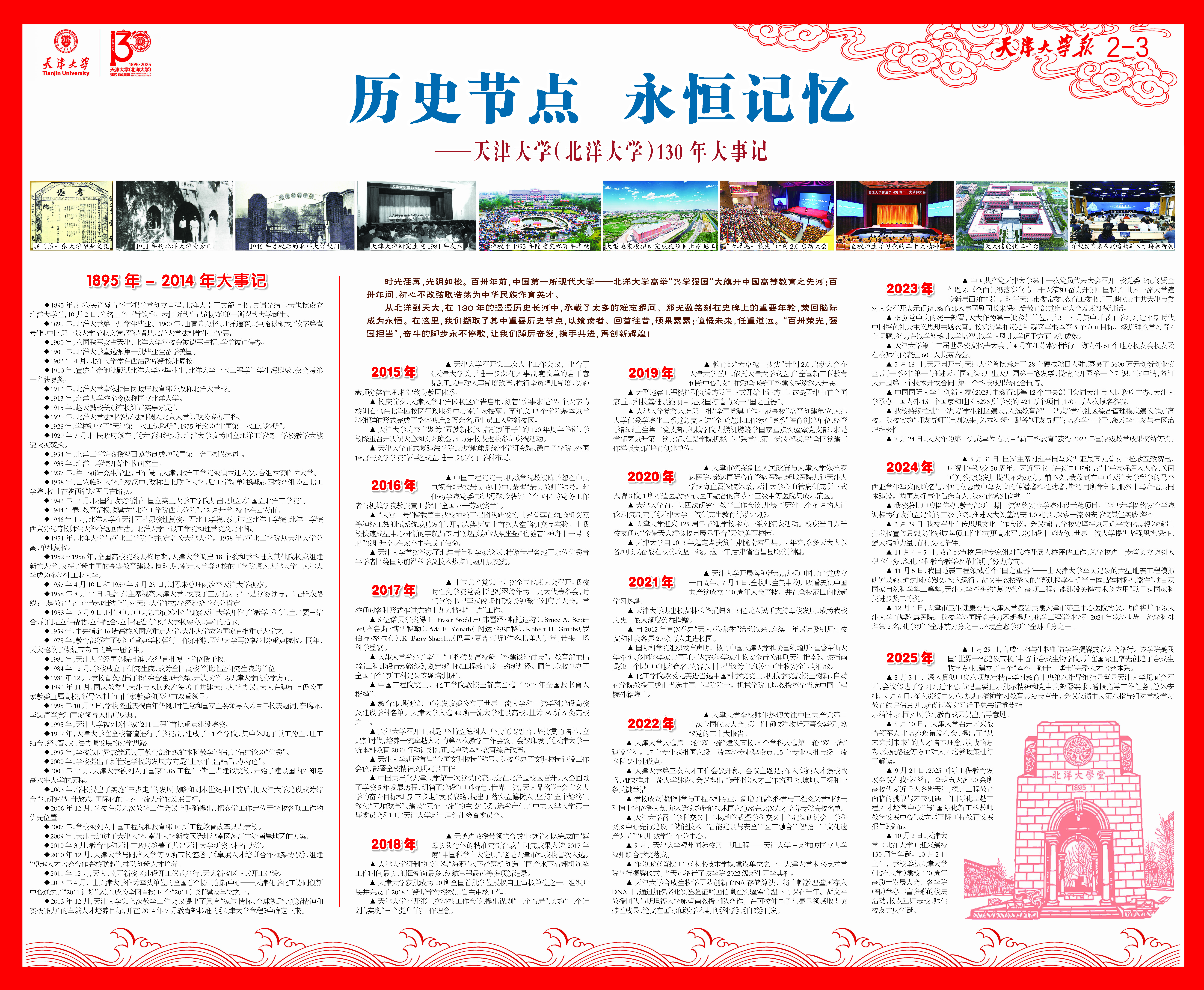 从北洋到天大,在130年的漫漫历史长河中,承载了太多的难忘瞬间。那无数铭刻在史碑上的重要年轮,萦回脑际成为永恒。在这里,我们撷取了其中重要历史节点,以飨读者。回首往昔,硕果累累;憧憬未来,任重道远。“百卅荣光,强国担当”,奋斗的脚步永不停歇,让我们踔厉奋发,携手共进,再创新辉煌!