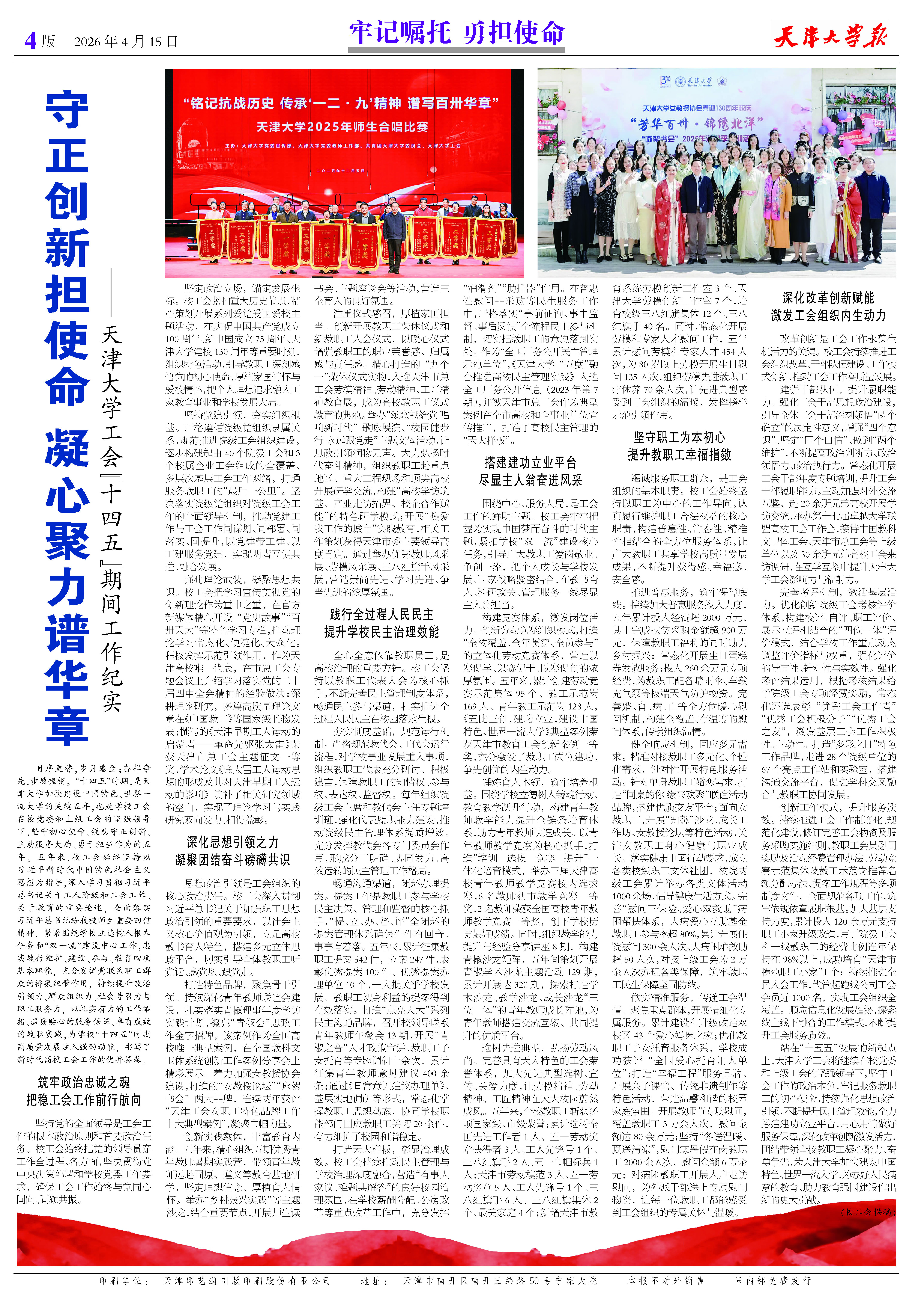 站在“十五五”发展的新起点上,天津大学工会将继续在校党委和上级工会的坚强领导下,坚守工会工作的政治本色,牢记服务教职工的初心使命,持续强化思想政治引领,不断提升民主管理效能,全力搭建建功立业平台,用心用情做好服务保障,深化改革创新激发活力,团结带领全校教职工凝心聚力、奋勇争先,为天津大学加快建设中国特色、世界一流大学,为办好人民满意的教育、助力教育强国建设作出新的更大贡献。