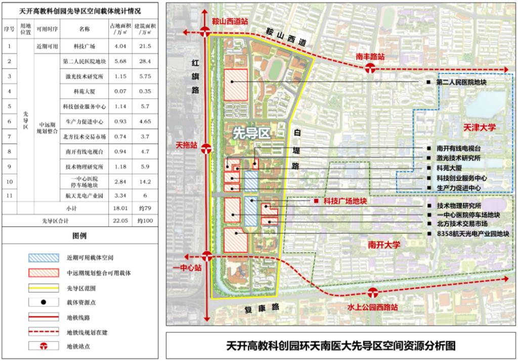 核心区内划定“鞍山西道—白堤路—复康路—红旗路”合围区域为先导区,占地面积约1.1平方公里。以天津科技广场为核心、科研西路为中轴向两侧延伸的11个空间载体为主要供给,可提供总占地面积22.05万平方米、总建筑面积100余万平方米的载体空间。