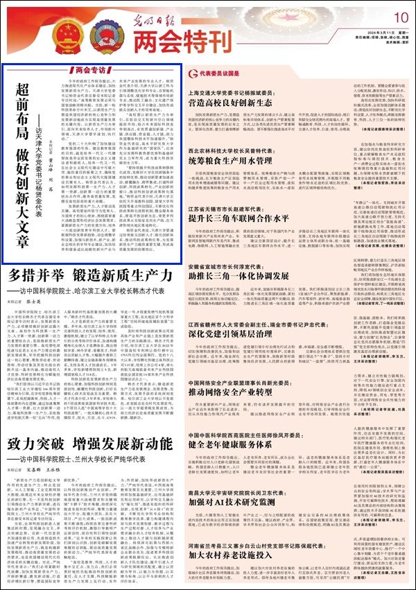 “高校要以新质生产力为牵引,在前沿交叉和新兴空白领域超前布局,抢占未来国际科技竞争制高点,有效贯通创新链、产业链、供应链、资金链、人才链,助力我国整体科技水平加速提升。”杨贤金代表说,高水平研究型大学作为基础研究的“国家队”,应该充分发挥科教资源优势和基础研究主力军作用,成为重大科技突破的生力军。