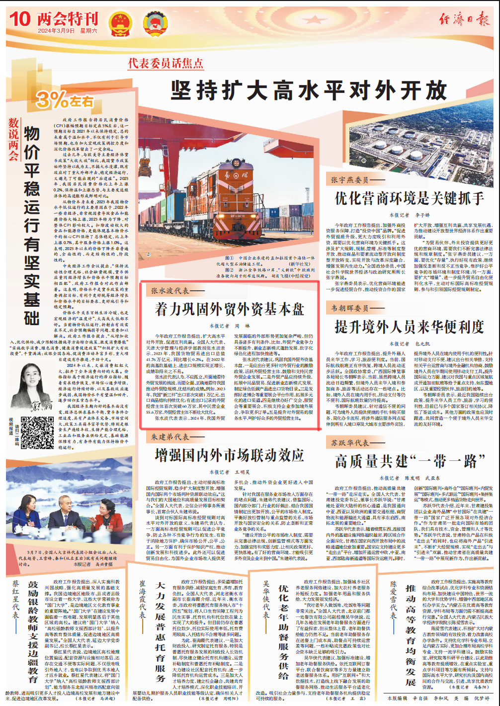 张水波代表认为,不应孤立、片面地看待外贸发展的挑战,而要全面、正确地看待我国推动外贸稳规模、优结构的成绩。例如,2023年,我国“新三样”出口首次突破1万亿元,出口商品结构持续优化;有进出口记录的外贸经营主体首次突破60万家,其中民营企业55.6万家,外贸经营主体不断壮大优化。