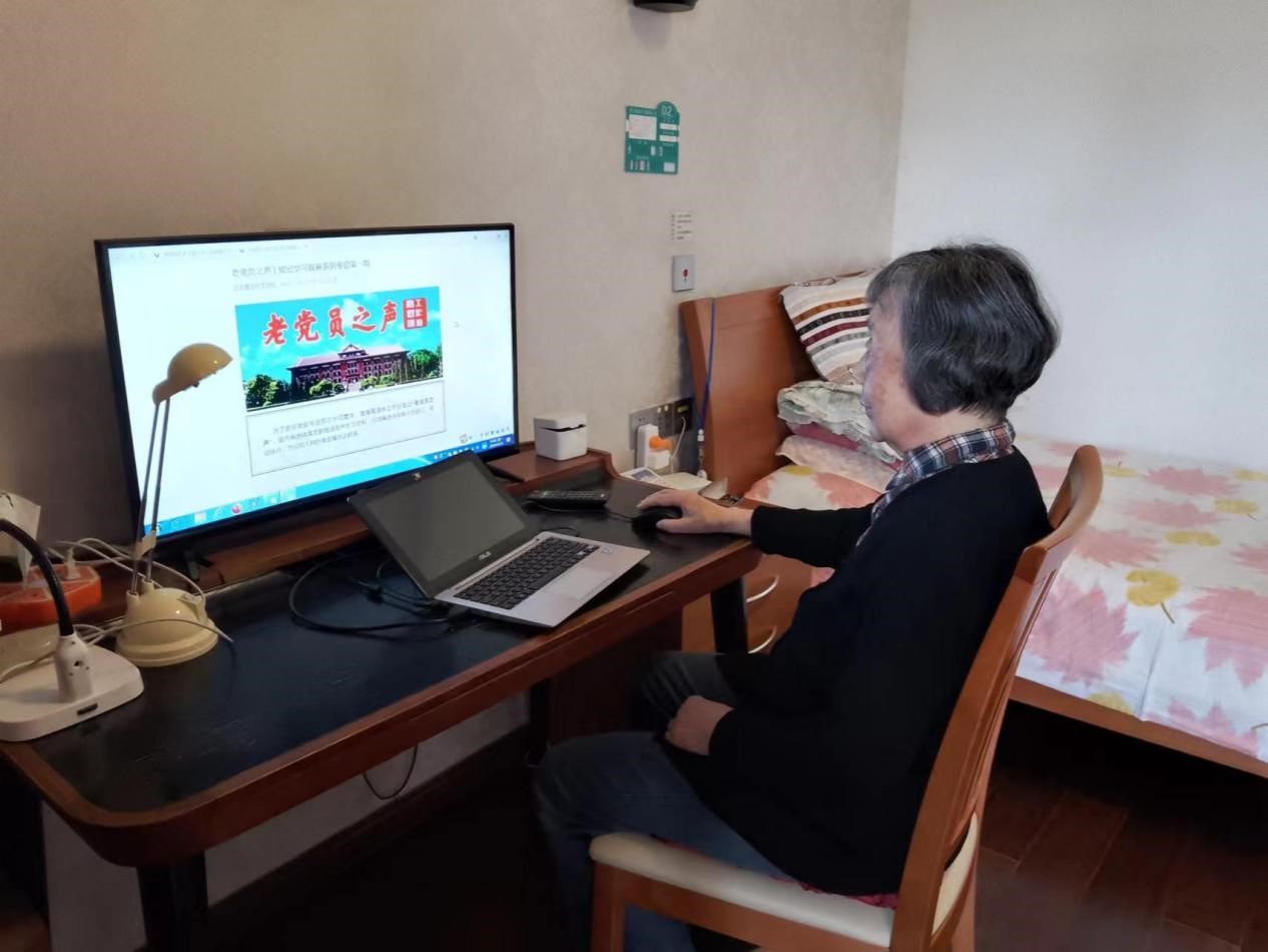 图注:89岁高龄的机关退休第三党支部党员刘德符老师,在养老院收听学校离退休工作处微信公众号“老党员之声”“党纪学习教育专栏”中同志们朗读的《中国共产党纪律处分条例》。