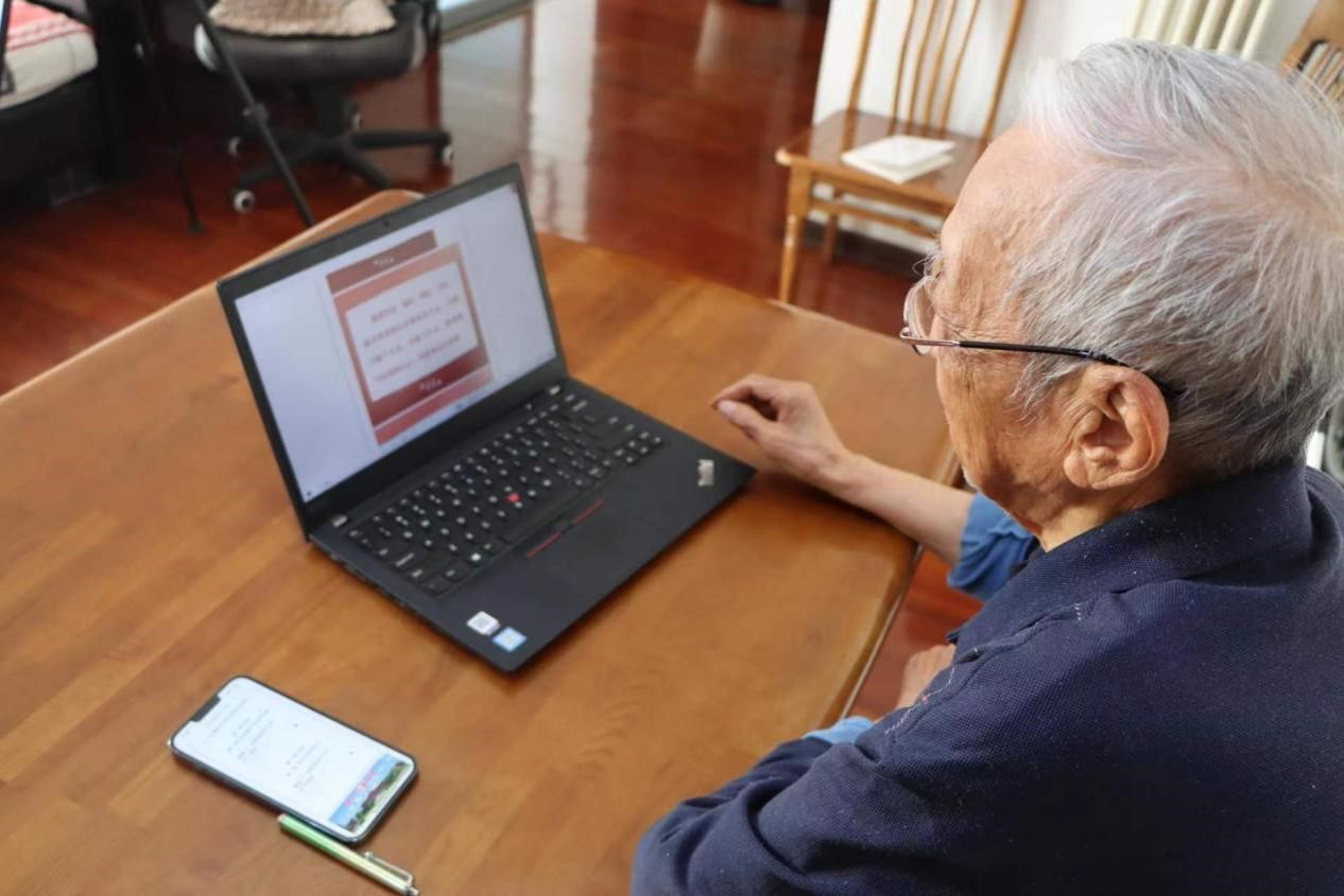 图注:91岁高龄的离休干部王珍玺,居家认真收听学校离退休工作处微信公众号“老党员之声”“党纪学习教育专栏”中同志们朗读的《中国共产党纪律处分条例》