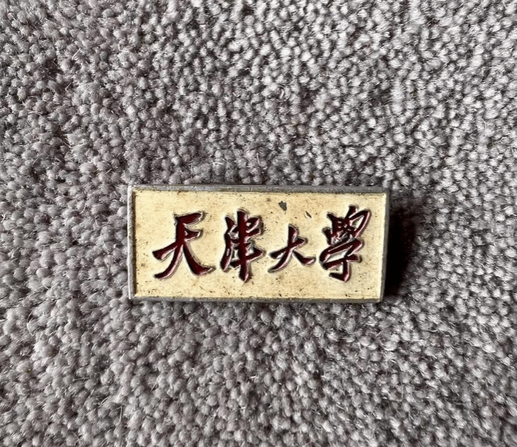 笔者收藏的天大本科学生校徽(白底)、81科英苏建华同学收藏的研究生校徽(绿底)、教工校徽(红底)
