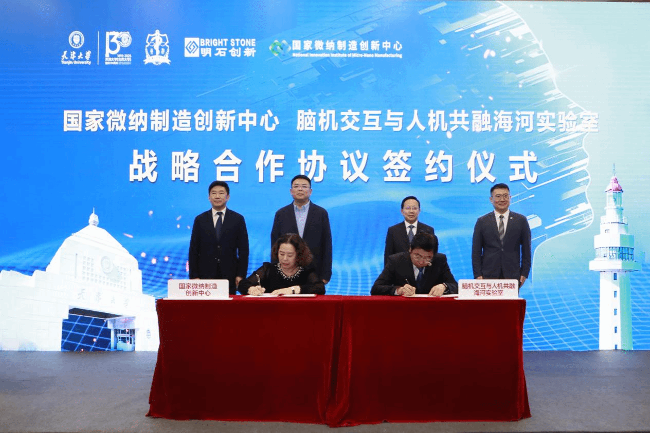 在高峰、杨灏、柴立元、明东的见证下,唐焕新与脑机交互与人机共融海河实验室常务副主任倪广健,分别代表国家微纳制造创新中心、脑机海河实验室签署战略合作协议。双方将充分发挥在微纳制造与脑机接口领域的技术与资源优势,共同推动脑机交互关键材料与核心器件的自主创新,为我国前沿科技创新和战略性新兴产业发展注入强劲动能。