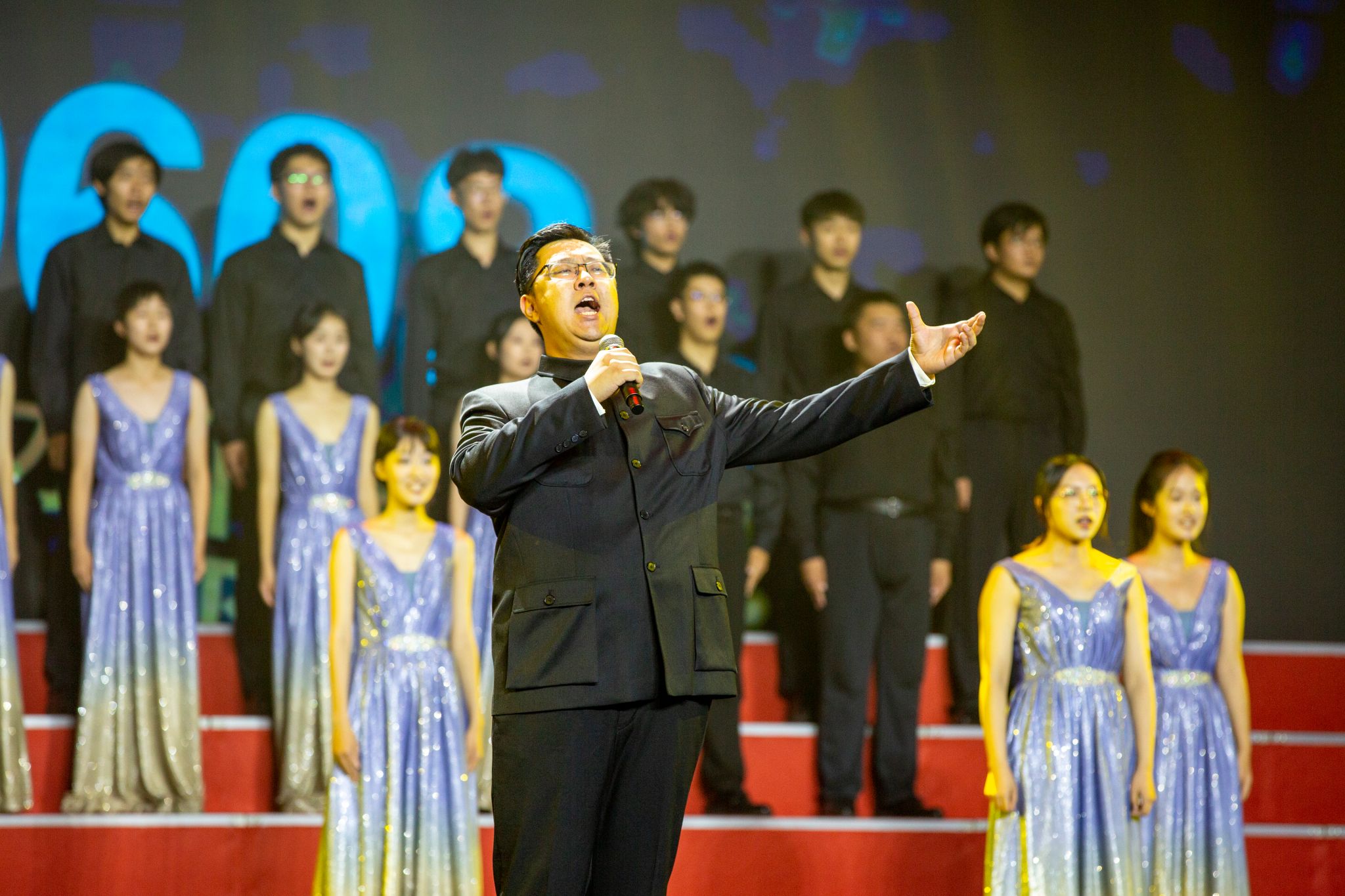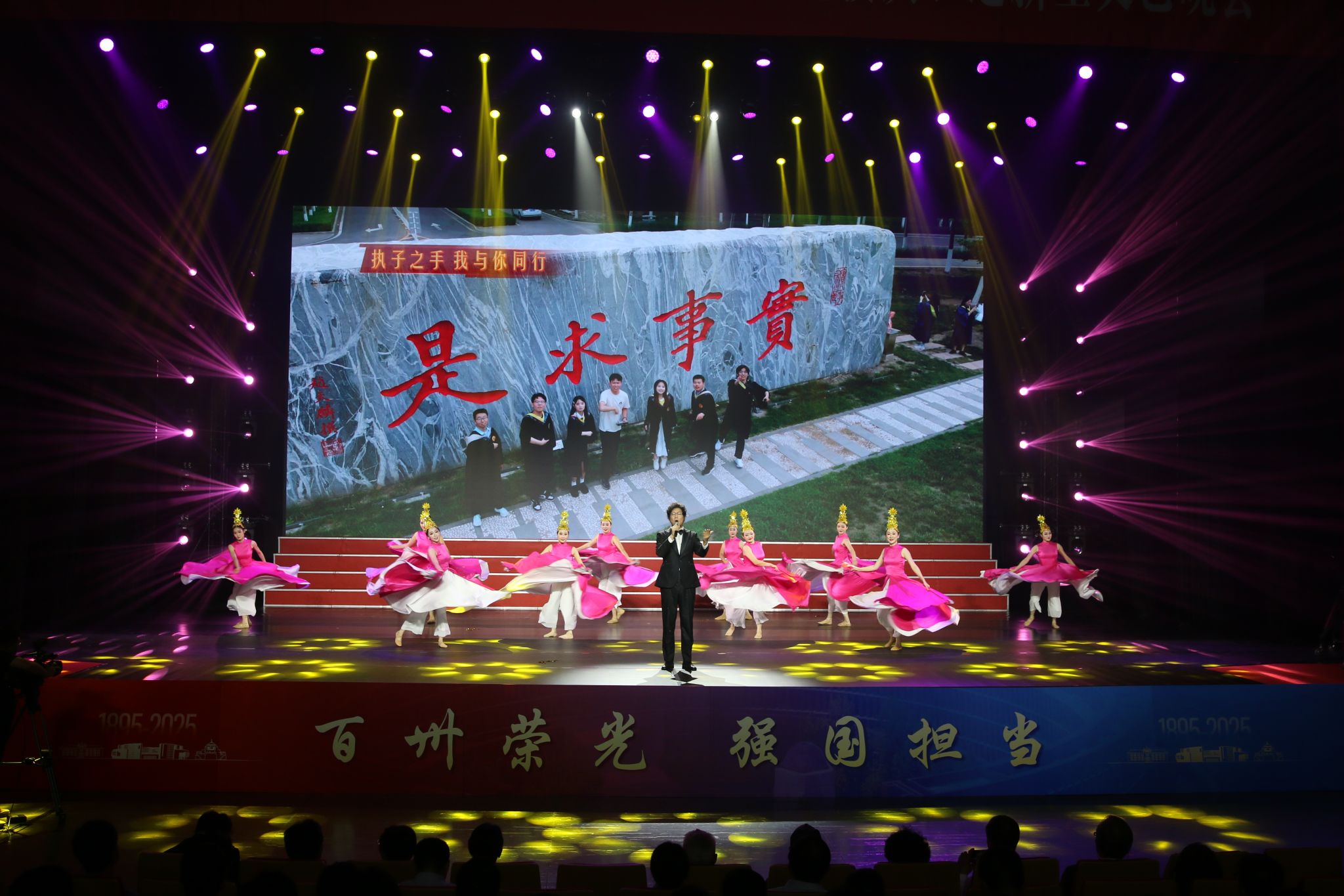 群舞与特色节目相映成趣,彰显天津大学深厚的文化底蕴。《大美之地》在天地人文的交响中,以蓬勃生命力呈现出 “天大之美”的意境;北洋舞蹈团带来的《秋熟》象征 130 年来天大人 “不从纸上逞空谈,要实地把中华改造” 的初心坚守;《马来西亚留学生的一天》展现了“留学天大” 工程启动以来,学校扎根中国、面向世界的开放姿态。天大人原创歌曲《与你同行》了唱出所有校友与母校的约定及天大人与祖国同行的坚定信念。晚会最后,全场师生起立合唱《天津大学校歌》《歌唱祖国》,由天津大学艺术教育中心名誉主任任宝平教授担任指挥,激昂旋律中尽显天大人的使命担当。