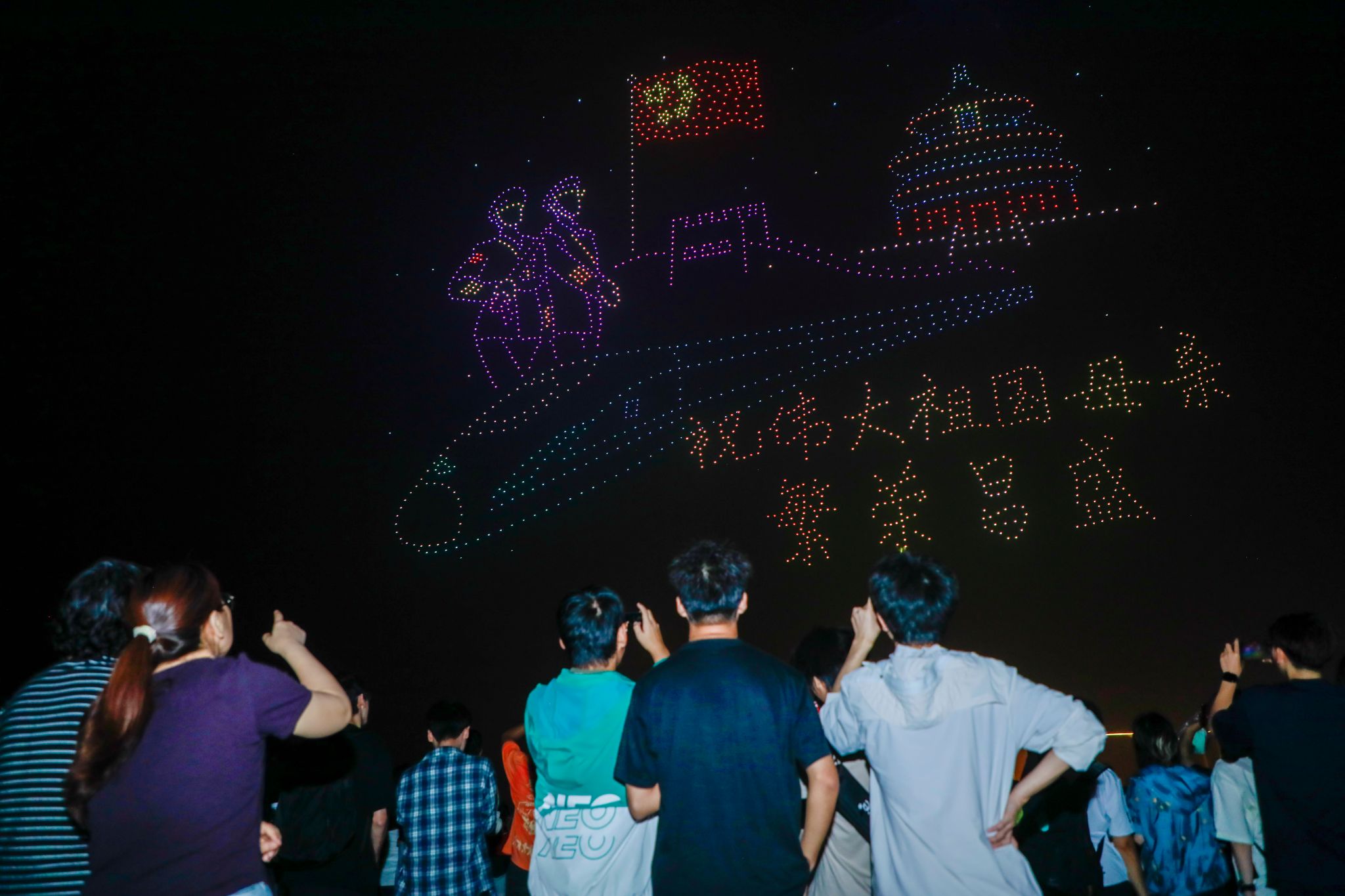 “看!是天津大学校徽!”,伴随着现场的声声惊叹,北洋园夜空中的光点正跟着节奏变换——先是整齐列队拼出130周年校庆标识,转眼又化作北洋纪念亭、第九教学楼等熟悉的天大地标……10月1日晚,两千架无人机自国家大型地震工程模拟研究设施前广场列阵而起,以灵动的光影为祖国76周年华诞献上“天大”的祝福。青年湖畔、太雷广场人声鼎沸、氛围高涨,师生校友在此共赏百卅荣光。