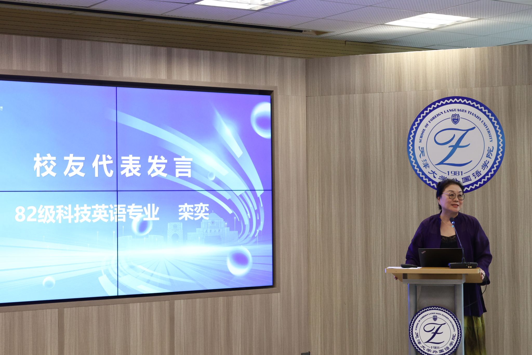 来自不同年代的校友代表依次登台发言。82级科技英语专业校友高小杰感恩母校的培养,在校所学令其有了立身之本,求学生涯中师长的教诲培养了其端正的人生态度,并表示愿继续发光发热,持续关心学校和学院发展。82级科技英语专业校友栾奕从母校培育、跨界成长以及家庭传承几个方面谈及个人奋斗历程,饱含了对母校的深情。83级科技英语专业校友林夕宝分享了以“实事求是”深耕教育之路的创业历程,生动诠释了将母校校训转化为教育创新动力的坚守与突破。91级科技英语专业校友杨震回顾求学岁月,感念母校培育之恩,盼与学弟学妹共话成长。92级科技英语专业校友郝景辉谈到,求学阶段天津大学外语系所展现出的人文关怀、跨学科学习以及国际化思维培养,皆成为了他受用一生的“终身财富”。