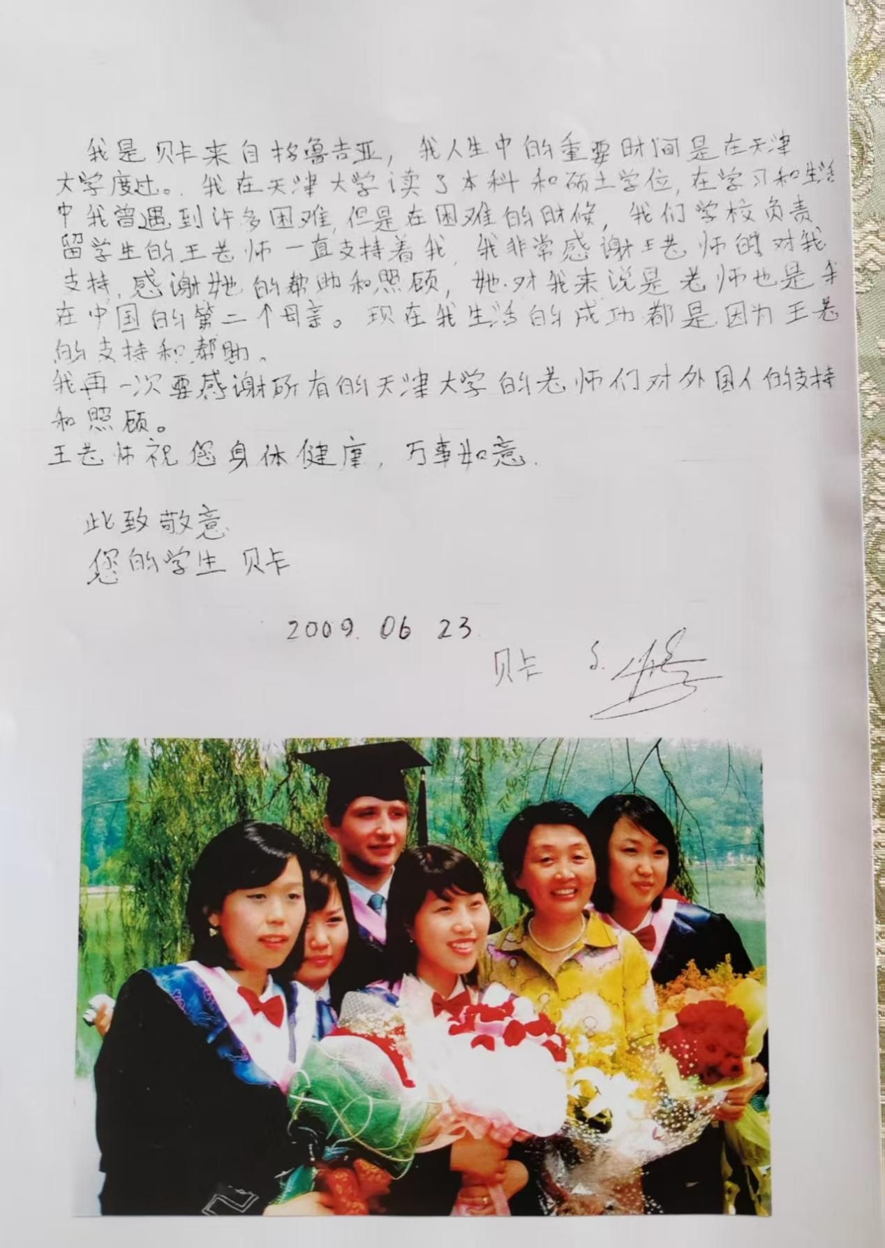 20年来,我与留学生朝夕相处,视他们为自己的孩子一样关爱、呵护,与他们建立了深厚的感情。2011年在我即将离开工作岗位退休之际,留学生们为我送来了鲜花和感谢信,表达了他们依依不舍的感激之情,使我深受感动。