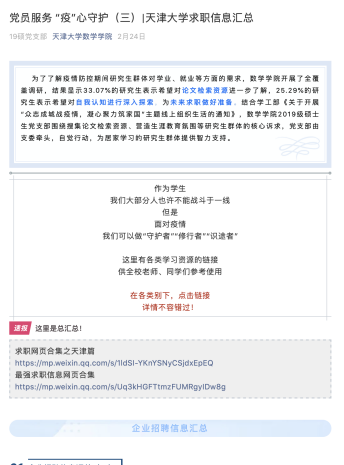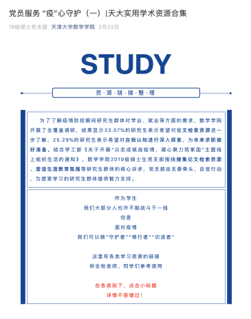 数学学院2019级硕士生党支部书记郝晨曦介绍了疫情期间党支部的组织生活开展情况,党支部在疫情初期积极落实“停课不停学”的号召,围绕搜集论文检索资源、营造生涯教育氛围等研究生群体的核心诉求,制作系列推送。推送主题紧扣当下各年级同学的需求,包括论文检索资源、营造生涯教育氛围、居家学习自我管理等,为同学们线上学习提供和极大的便利。
