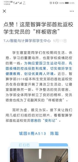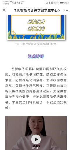 智算学部2016级本科生党支部委员、兼职辅导员李斯作为第一批返校的学生党员,分享了支部成员如何通过拍摄防疫视频等方式,向学部返校学生介绍途中自我防护知识。同时,党支部结合爱国卫生运动,通过打扫宿舍卫生、督促同学们遵守学校各项防疫规定等方式强化返校学生的疫情防控意识,为疫情防控工作的顺利开展提供有效助力。