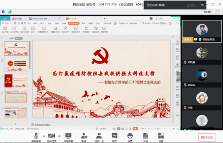智算学部2019级博士生党支部书记杨婷分享到支部在学习习近平总书记重要讲话《为打赢疫情防控阻击战提供强大科技支撑》后,邀请在智慧社会与大数据智能实验室的支部党员讲述AI技术科学战“疫”,助力安全复工的故事。通过成果展示、技术分享、交流感悟等,鼓励博士生们为疫情防控贡献青春力量,把科研、智慧应用在建设社会主义现代化强国的伟大事业中。