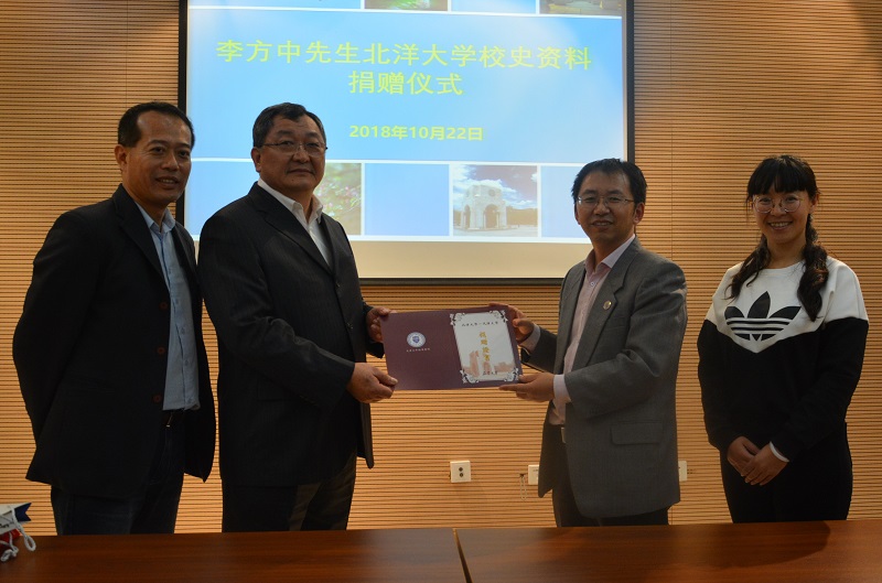 2018年年初,档案馆就通过上海校友家属与台湾校友李宏榜先生(李宏榜:北洋大学运输工程组1944年入校生)的后人李方中教授取得联系,李方中教授向档案馆表达了捐赠意向。10月23日,李方中教授利用到北京参加海峡两岸水利研讨会的机会,亲自来到天大校史馆参观,并同校友会和档案馆的老师们座谈交流。校友会和档案馆为李方中教授举办了资料捐赠仪式,李方中教授向档案馆捐赠了台湾校友会和李宏榜校友个人的珍贵资料。捐赠的具体内容有:老照片14张,徽章6枚,通讯录2本,知名校友遗像和悼词两份,北洋大学毕业纪念刊一本,瓷盘一个。其中,北洋大学三十七年班毕业纪念刊尤其珍贵,刊中有王宠惠亲笔签名的中国第一张大学毕业文凭图片和张含英校长的亲笔的刊名。