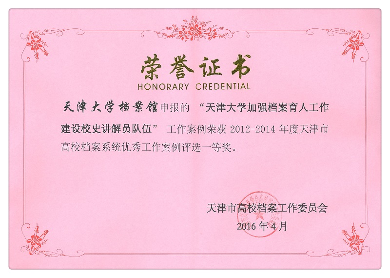 会上,表彰了2012-2014年度天津市档案系统优秀工作案例及天津市高校第11届档案学术论文。据悉,此次举行的天津市高校档案工作协会以“规范 创新 服务”为主题的优秀工作案例评选活动,在全国档案系统内是首次。活动通过案例评选,进一步凝练了高校档案工作的好经验、好规律,是各档案工作单位交流学习的好平台,也是一项开创性的工作。此次评选中,共有15个工作案例项目参与评选。通过案例申报、现场宣讲展示、不记名投票等环节,天津大学档案馆申报的“天津大学加强档案育人工作,建设校史讲解员队伍”工作案例脱颖而出,荣获一等奖。