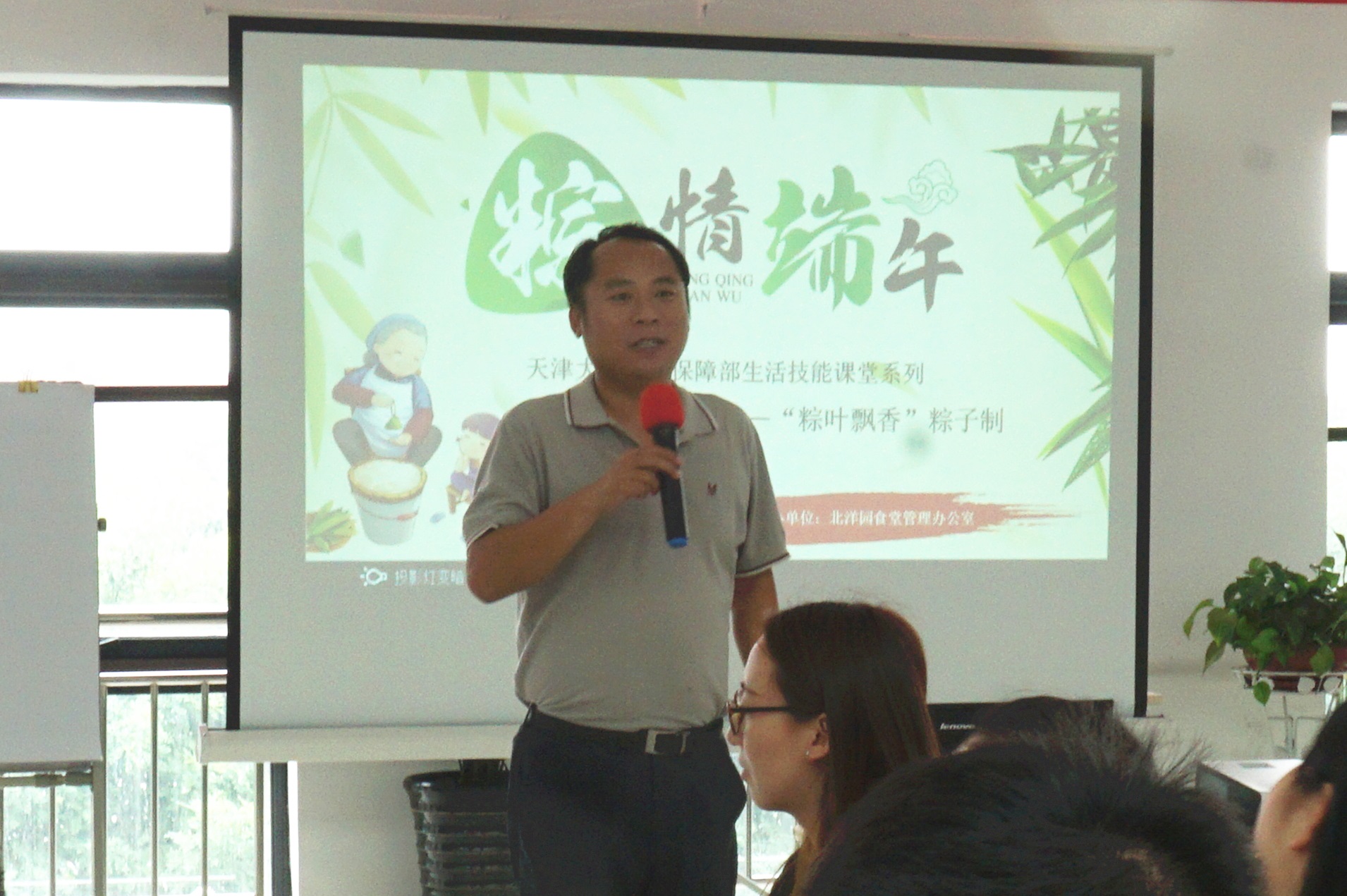 本站讯(通讯员 鹿露 唐婉)6月6日下午,后勤保障部生活技能课堂第二讲——“浓情端午、粽叶飘香”课堂在北洋园棠园餐厅二楼开课。后勤保障部党委书记杨志永、后勤保障部副部长王梦宾应邀出席,经过膳食中心公众号筛选的30位学生代表参加。