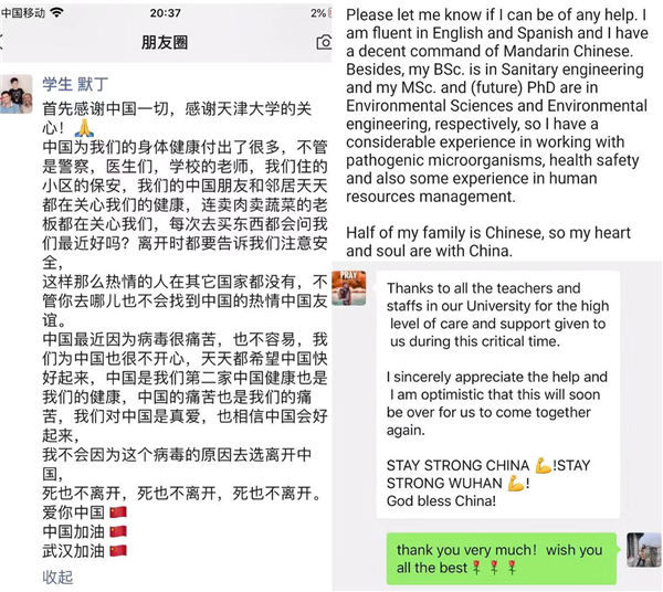 一、精准发力,逐一排查,织好“防控网”。学校专门成立了留学生疫情防控工作组,学校疫情防控工作副总指挥、主管外事工作的副校长胡文平担任组长;出台《天津大学留学生新型冠状病毒感染防控工作方案》等工作方案和预案,确保指挥高效、反应迅速、措施得当。发动各学院力量,组建了一支能吃苦能战斗的防控工作队伍,包片负责,责任到人,建立严密的“人盯人”校外住宿留学生防控工作网。国际教育学院在原有信息统计工作基础上逐一核查了近200名校外住宿留学生登记地址等个人信息,精准掌握了留学生校外住宿情况。第一时间向学生寄送《天津大学国际教育学院致校外住宿留学生同学的一封信》。信中,国际教育学院院长叮嘱学生注意防护,保证自身安全,再次明确告知学校关于疫情防控的相关要求和规定。信件寄出后,国际教育学院随时跟踪物流信息,逐一落实学生签收情况,在小区禁行、大雪封路的情况下,确保我校这份特殊的“新年礼物”及时送达每位学生手中。同学们通过多种方式表达对学校的感谢,同时承诺一定严格遵照执行学校关于疫情防控的相关要求。建工学院也门籍博士留学生默丁发朋友圈说:“感谢中国的一切,感谢天津大学的关心。中国是我们的第二个家,我们对中国是真爱,也相信中国会好起来”。