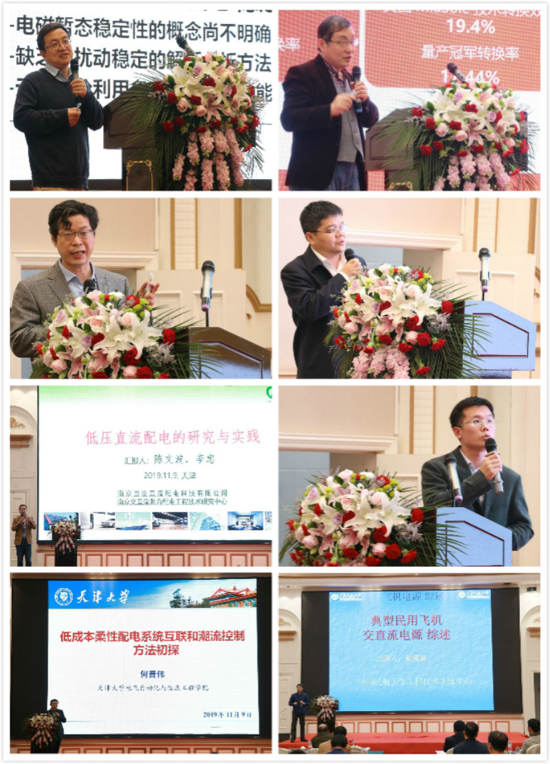 在接下来的主题报告会上,8位知名专家作了精彩的大会报告。清华大学姜齐荣教授作了题为《电力电子化电力系统的非线性震荡问题研究》的主题报告;汉能控股集团首席科学家武振羽先生介绍了在薄膜太阳能电池与绿色建筑方面的研究;华北电力大学韩民晓教授以《中压直流配电系统应用场景及特性分析》为题介绍了自己的学术工作;国家电网江苏电科院袁宇波总工程师分享了中低压直流配电网工程实践;南京国臣直流配电科技有限公司总经理李忠向大家重点介绍了在低压直流配电方面的研究与实践;天津大学何晋伟教授作了《低成本柔性配电系统互联和潮流控制方法初探》的主题报告;天津大学李博通副教授作了《构建柔性直流配电网的控制保护关键技术》的主题报告;中国民航大学黄复清教授整体介绍了民用飞机典型航空电源交直供配电技术的研究现状。