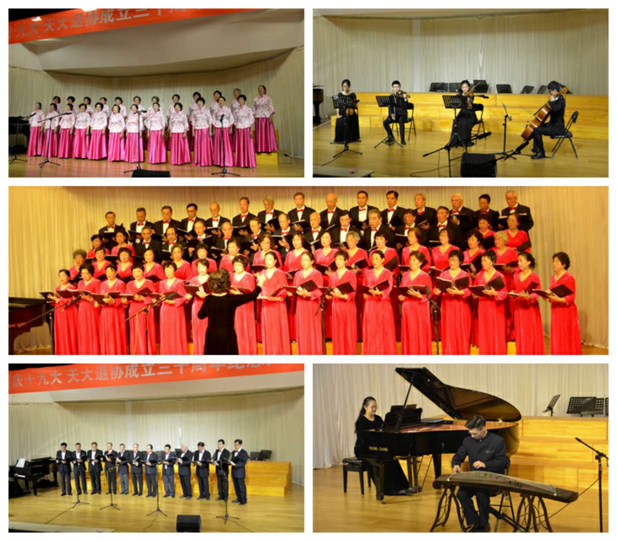 “喜庆十九大音乐会拉开序幕。老同志们用悠扬的音乐、欢乐的歌声,表达了他们对十九大胜利召开的喜悦之情,对中国特色社会主义新时代的热爱,对伟大祖国的美好祝福。北洋艺术团的青年学生也为老同志们献上了自己的精彩节目,表达了对退休教职工协会成立三十周年的祝贺,和对实现中华民族伟大复兴中国梦的美好期盼。老少同台、其乐融融,现场气氛温馨而热烈。