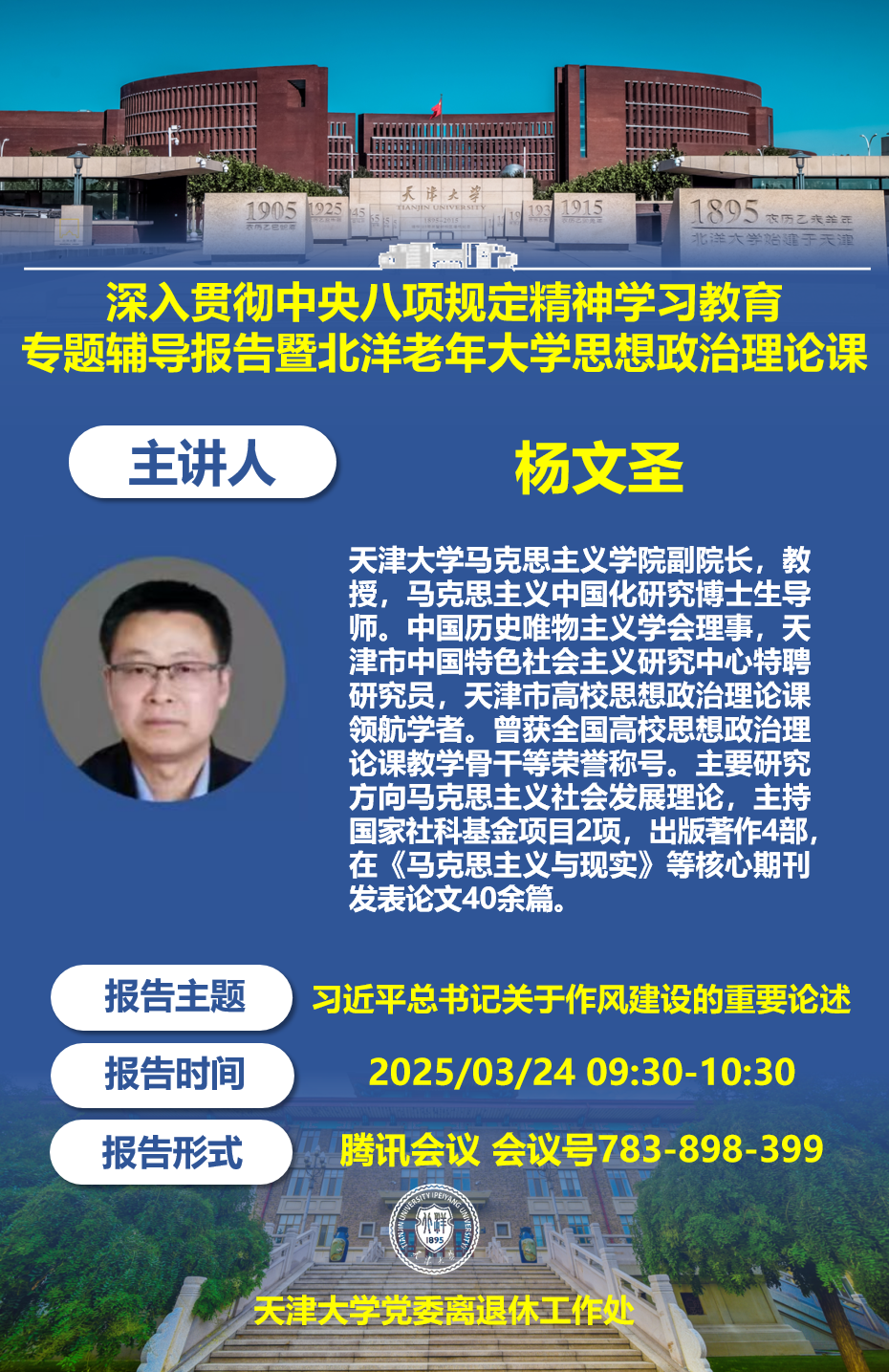 本站讯(离退休工作处供稿)为落实中央和学校党委统一部署,开展好深入贯彻中央八项规定精神学习教育,3月24日党委离退休工作处举办专题辅导报告暨北洋老年大学2025年春季首场思想政治理论课,邀请天津大学马克思主义学院副院长杨文圣教授,为老同志作题为“习近平总书记关于作风建设的重要论述”专题报告,校关工委成员,离退休党支部书记,离退休党员,老年工作者近百人参加。