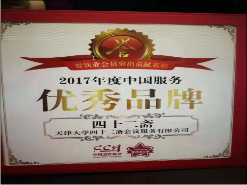本站讯(通讯员 古燕)2018年11月18日,由中国烹饪协会举办的2017年度全国餐饮行业“中国服务”系列评选活动在人民大会堂隆重举行。天津大学四十二斋会议服务有限公司(天津大学会议接待中心)被评选为 “2017年度中国服务优秀品牌”,天津大学42斋是全国高校宾馆中第一家获此殊荣的企业。