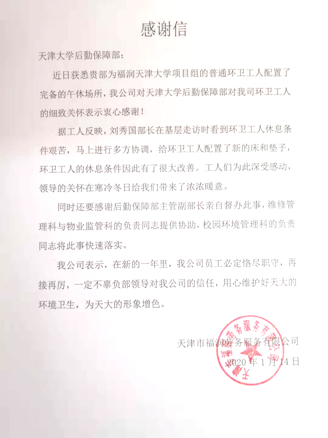 1月14日,全新的工人休息区正式启用,环卫工人们目睹了在后勤保障部多个科室共同努力下,短短3天内全新的午休区域,纷纷表示深受感动,非常感谢后勤保障部在寒冷冬日给大家带来的浓浓暖意,他们用经久不息的热烈掌声和止不住的幸福笑容表达自己对后保部感谢。福润公司驻天津大学项目部经理刘承说:“感谢部领导对我们环卫工人的关怀,我们真的感觉到暖到了心坎里,感觉到我们就是天津大学的一员,做好环卫清扫的力量更强心气更高。”环卫工人李玉琴说:“天津大学就是我的家,新的一年我一定再接再厉,努力把‘家’打扫的干净、整洁,不辜负刘部长对我们的关心和照顾。”