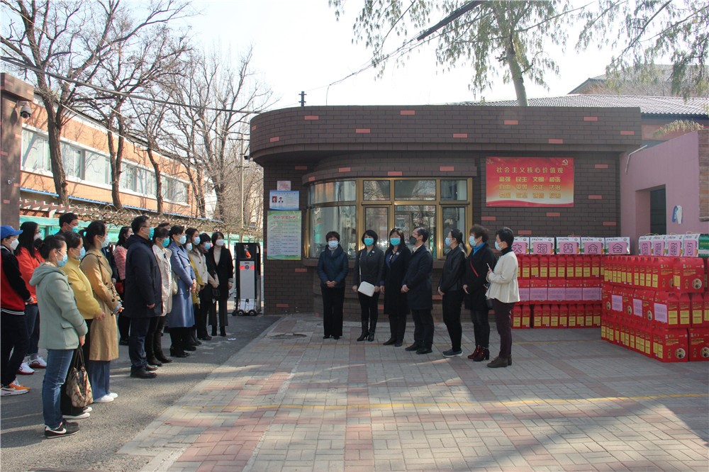 慰问品捐赠仪式在附属小学举行。天津大学建工学院大海助学基金会理事长、建工学院副院长高喜峰,小幼医党委书记、工作部部长赵翠云,副书记、副部长刘津,及附小、幼儿园、校医院相关领导和防疫先进代表等参加了捐赠仪式。