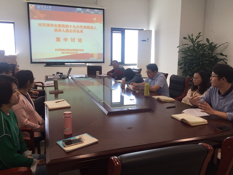 本站讯(通讯员 孙迎辉)4月27日,北洋园校区物业管理党支部召开党员大会,对天津市出席党的十九大代表候选人初步人选公示名单进行集中讨论。