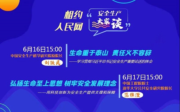 “安全生产月”期间,安全生产知名专家、地方政府部门领导、企业安全生产负责人和一线技术工人齐聚人民网,共话安全。6月16日下午15时,中国安全生产科学研究院原院长刘铁民讲授《学习贯彻习近平总书记安全生产重要论述的体会》,6月17日下午15时,中国工程院院士 清华大学公共安全研究院院长范维澄讲授《用科技创新为安全生产提供支撑和保障》。