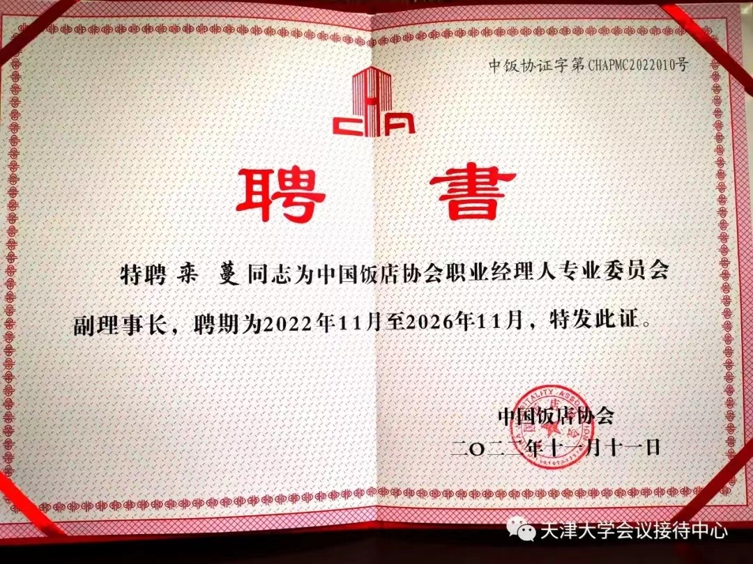 天津大学会议接待中心在此次大会中荣获“2022中国酒店品质服务TOP100”殊荣,中心总经理栾蔓被特聘为“中国饭店协会职业经理人专业委员会副理事长”并被授予“2022饭店业职业经理人年度30人”,副总经理古燕被授予“2022饭店业职业经理人年度30人”。