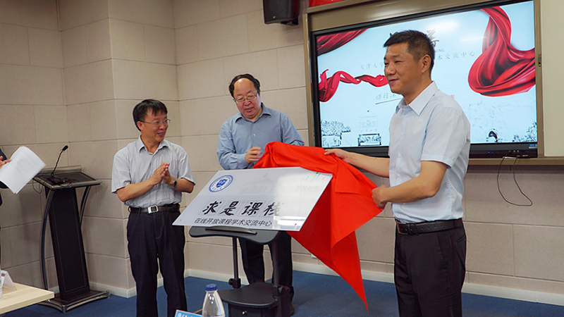 市教委高教处处长连忠锋(中)与教务处处长张凤宝(左1)、“智慧树网”副总裁李威为课栈揭牌