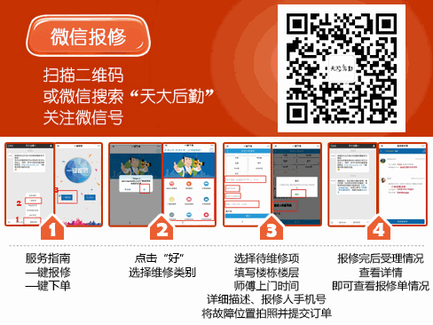 本站讯(通讯员 金中婷)有呼必应,真诚服务师生,方便快捷的报修服务就在您身边,后勤保障部成立一站式报修服务中心并于即日起正式运行。报修中心整合了卫津路校区上下水、土建、木工、中航物业、东吴物业的报修服务,过去要几个电话找不同部门报修,现在只需打一个电话、发一条微信,就能满足综合报修、预约服务、查询信息、投诉建议等服务需求,还安排有客服人员热情接待师生现场报修。报修中心将管理要求寓于服务流程,实现环节管理、信息反馈和服务评价的闭环式管理,欢迎广大师生体验便捷优质的“一站式”后勤服务,我们用心服务换您满意笑容!