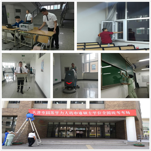 这次考试借用第26教学楼A区全部教室,物业方面前期做了充分的准备工作:打印清理个人物品的温馨提示通知,并粘贴在A区入口玻璃门上,提醒师生在考试期间,提前做好上课、自习等教学活动需借用教室的工作;对教室内照明、接线插口进行全面排查,发现故障及时更换维修,确保考试期间照明等用电设备正常使用;进行楼宇巡视,巡查每间教室课桌椅是否损坏、地面是否破损、中央空调管道是否漏水等情况,发现问题及时报修,并跟进维修情况,确保考试期间教室内设施设备正常使用;协助学校相关部门对第26教学楼地下地源热泵机组进行开机制冷切换及调试,并检查教室内中央空调运行情况、监测室内温度是否适宜,为师生营造一个舒适的应考环境。考试前夕,物业方面逐层、逐间教室清理书本等物品,对所有活动桌椅按照考试要求摆放并在一层西侧大厅摆放了8张桌子、10把椅子,以备使用;A区门口张挂横幅;做好每间教室的门窗、地面、黑板等卫生清洁工作,确保考场内卫生干净整洁,为考生创造一个良好的考试环境。