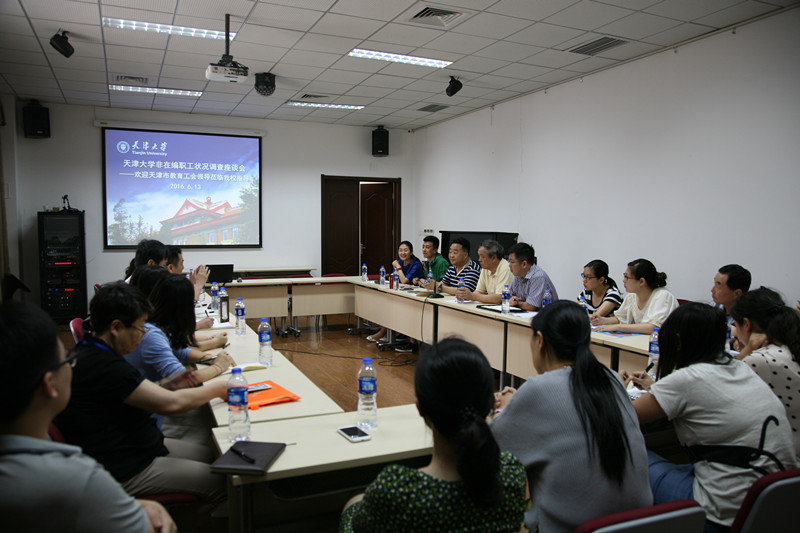 本次调研的主题是非在编职工状况的调查。座谈会分两个阶段进行。第一阶段,张家翔一行就我校非在编职工用工方式、依法规范事业单位非在编职工管理及面临的困难等感兴趣的问题和与会人员进行了深入的交流。人事处副处长张鹏、人事处人才资源管理中心主任孙浩就天津大学非在编职工情况进行了简要介绍,我校目前有非在编职工近2000人,主要是劳务派遣、人事代理及临时合同三种用工方式。后保部副部长张超英就后保部非在编职工的基本情况做了介绍,同时对这几种用工方式面临的一些困惑做了说明。第二阶段,张家翔一行与我校10名非在编职工就其思想状况和利益诉求等内容进行座谈。
