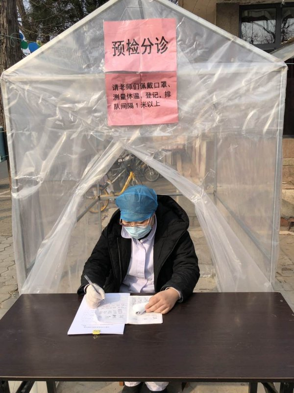 在新型冠状病毒疫情期间,校园管理更加严格。为了能够做好对取药老师的健康检测工作、把好第一道关口,在临时取药点工作空间有限的情况下,校医院在室外设立了预检分诊处。工作人员不畏严寒,始终坚持做好每一位患者的体温检测筛查和详细的调查记录登记工作。