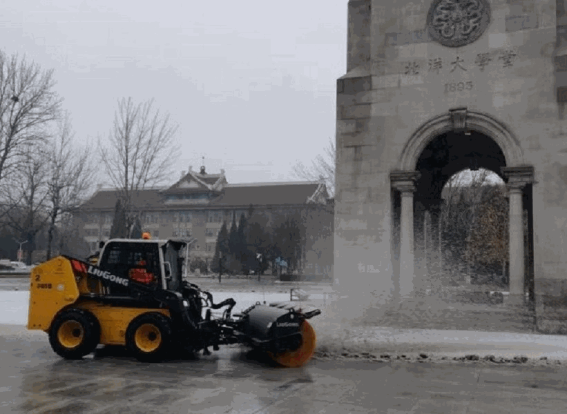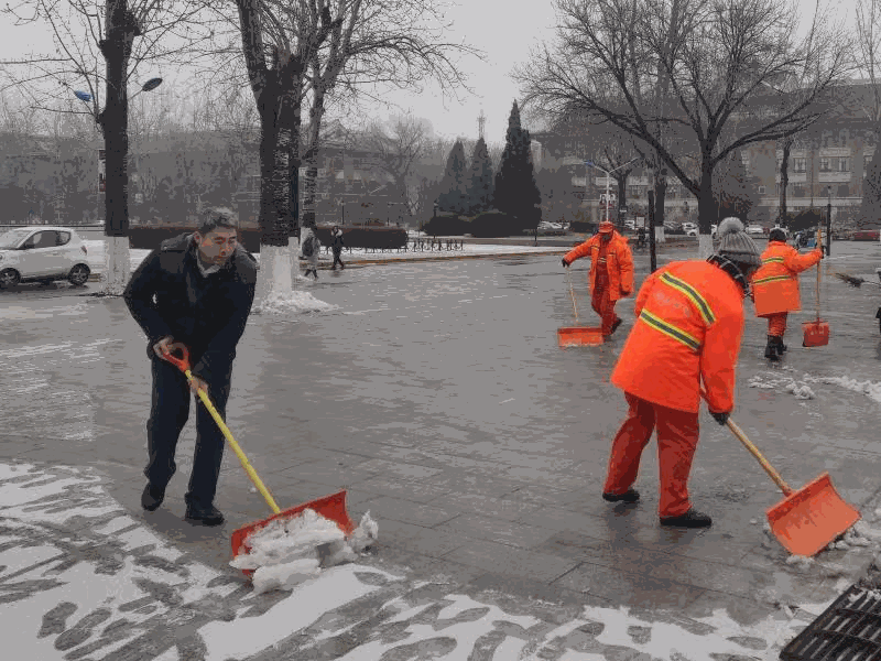 根据校园内无盐清雪的要求,针对雪情变化和路面积雪情况,做到边下边清,先人工将便道积雪清扫至绿地或车行道一侧,避免行人将积雪踩实成冰;再用大型扫雪设备将车行道积雪扫至道路两侧,人工配合扫雪设备将两侧积雪推成堆;最后人工将雪堆及雪水就近推入雨水井内,完成道路的清雪工作。此外,针对北洋广场东区这种不能上大型清雪设备的场地,采取人工集中清扫的方式进行清雪作业。