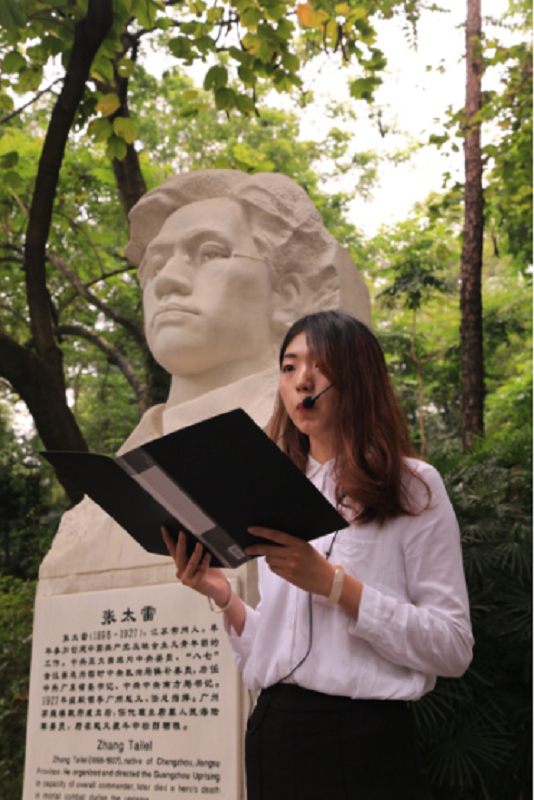 太雷班学员还自发组织了两场纪念缅怀活动。在广州起义烈士陵园,组织祭扫活动,缅怀烈士、祭奠英灵。活动中,太雷班代表向广州起义领导人塑像敬献花束,向广州起义纪念碑敬献花圈,并在张太雷烈士塑像前演绎原创作品《追忆太雷风骨,传承太雷精神》朗诵剧。校团委组织部部长谢圆圆与广州起义烈士陵园副主任唐庆坤分别代表双方单位签署了共建爱国主义教育基地的协议,为未来的红色革命教育合作奠定基础。在团一大广场,在庄严的团旗下,全体太雷班成员重温入团誓词,共唱团歌,朗诵原创作品《太雷诗》,缅怀先烈。