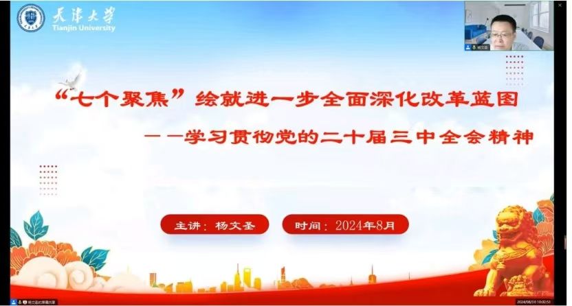 本站讯(通讯员 刘旸)为深入学习贯彻党的二十届三中全会精神,8月30日上午,党委离退休工作处举办学习贯彻党的二十届三中全会精神专题辅导报告会暨天津大学北洋老年大学2024年秋季首场思想政治理论课,邀请马克思主义学院副院长杨文圣老师作题为《“七个聚焦”绘就进一步全面深化改革蓝图——学习贯彻党的二十届三中全会精神》的辅导报告。校院两级关工委老同志,离退休党支部书记、支部委员和部分党员,北洋老年大学学员,党委离退休工作处全体工作人员和老年工作者共一百四十余人以及共建单位和平区委老干部局离退休干部八十余人参加了此次报告会。