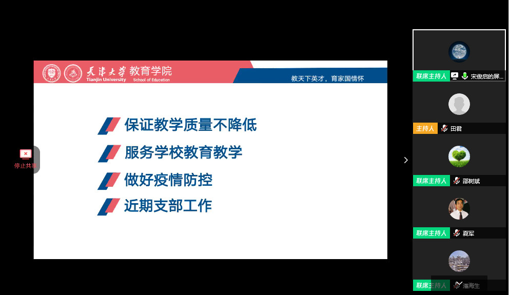 最后,学院党委书记宋俊启讲话。他重点强调了学院当前三项重点工作。一是保证教育质量不降低。二是服务学校教育教学,体现教育学院的价值和作用。三是做好疫情防控工作,落实日报制度,返津教职工注意防护,关注学生心理辅导与教育。同时,他布置了近期党支部工作,要求各支部结合疫情防控,开展线上学习研讨、迎政治生日创工作亮点和靶向服务工作。他希望全体教职工合理安排疫情防控和教学科研,扎扎实实做好各项工作,圆满完成今年工作目标。