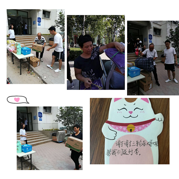 卫津路校区,物业在假期里就配合学校完成新生宿舍的粉刷、家具进场、配套设施安装的工作,提前做好工程检修、卫生清扫、窗帘清洗、接待人员培训等各项准备工作,营造舒适、整洁、干净的宿舍环境。迎新前期,物业监管部门就多次组织外包服务企业召开迎新工作会议,确保迎新工作各环节准备到位、有条不紊地进行。为学生宿舍发放卫生清洁工具,对宿舍各方面设施进行巡检、维修,确保新生入住品质。迎新当天,物业在学生公寓园区内摆放鲜花、张贴道路指引标识、悬挂横幅,营造了温馨、愉快的迎新氛围;设立了服务台并准备急救箱、饮用水和校园地图等;在公寓门口安排接待员的同时也安排了大量工作人员,为有需要的同学搬运行李,为新生和家长提供全方位的贴心服务。17教学楼精仪学院的物业工作人员主动找来三轮车一趟又一趟地帮新生和家长们搬运行李,细心周到的服务也感动了新生和家长,他们送上了表达谢意的小卡片,也是对物业工作的积极肯定。