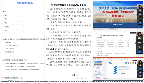 学生返院前,区域院学工办制定了《2020年春季学期前沿院返院须知(学生版)》,经区域院党政联席会讨论完善并上报学工部及学生学籍所在学院后发布。同时,由辅导员根据前沿院实际情况重新设置返院应知应会测试、返院承诺书,并在两批学生返院前分别召开行前培训,讲解返院当日安排、返院后日常管理及突发事件应急处置,并嘱咐学生在返程过程中做好防护。