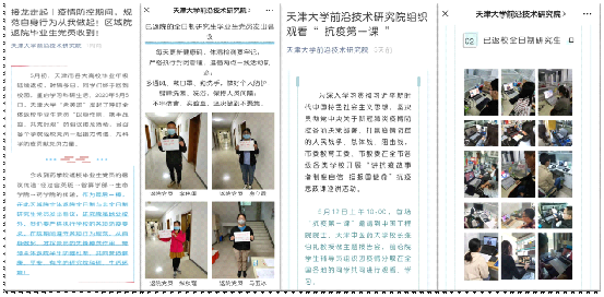 学生返院后,区域院开展了一系列思想教育及引领活动:发动返院全日制、非全日制党员发出倡议,严格执行各项防疫要求,在院期间遵守各项行为规范,带领全体返院学生防微杜渐,共同营造健康、平安、有序的研究院科研、生活环境;组织返院学生对宿舍和实验室进行爱国卫生大整治专项行动,培养良好的个人卫生和公共卫生习惯,切实抓好学生健康教育,创设优美育人环境;通过多种形式组织因疫情分散在全国各地的学生观看“抗疫第一课”,通过抗疫故事增强学生的制度自信、文化自信,激发学生勇担报国使命;注重学生的心理健康状况,为学生转发《天津大学复学心理第一课》,帮助学生顺利度过返院过渡适应期。