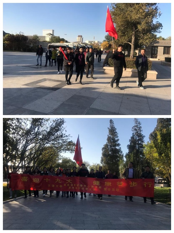 绿荫小道上,健步行活动开始了,大家迈着矫健的步伐,高举党旗,携手同行。行进过程中,两个支部对彼此的工作有了更深层次的了解和理解,并建立了深厚的感情,也是后勤支部与校内教工支部工作的一次深入交流和学习,充分验证了老带新,传帮带,党团共建的重要性,用创新、健康的方式向党的十九大献礼。