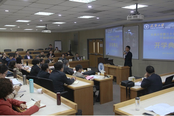 本站讯 (通讯员 李岩)2017年4月11日上午,天津大学第三十九期新疆干部培训班开学典礼在天津大学第25教学楼三层A教室举行。天津大学党委常务副书记、副校长舒歌群,天津大学党委组织部、统战部部长马春有,天津大学研究生院高端培训办公室主任殷红春,天津大学管理与经济学部主任张维,党委书记李连种出席了本次典礼。典礼由天津大学管理与经济学部副主任张水波主持。