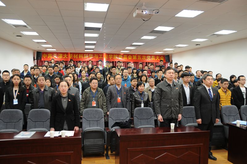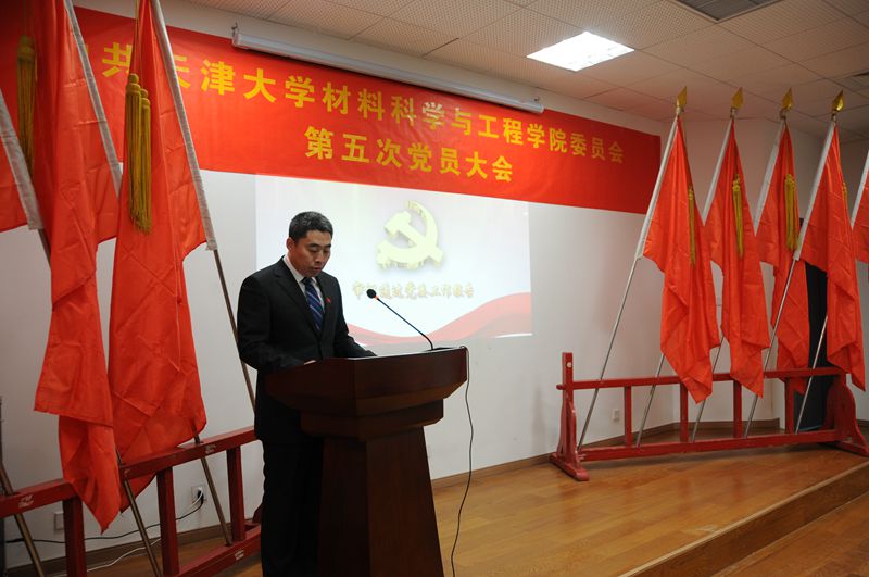 会议在嘹亮的国歌声中拉开帷幕,在审议通过大会议程(草案)之后,材料学院党委书记刘秀国同志代表第四届党委会向大会作了题为《凝心聚力改革创新 为实现材料学院跨越式发展而努力奋斗》的工作报告。本次大会是在北洋园校区召开的第一次学院党员大会,也是我院向一流材料学科迈进的重要一步。报告从人才培养、师资队伍建设、学科建设、科研成果和国际合作与交流五个方面回顾了学院整体事业取得的成绩;从学院党委深化党风廉政建设,规范党支部建设和党员管理,凝聚文化力量,加强大学生思政教育,发挥保障监督作用,护航学院事业发展等方面总结了四年来的党建工作成果;提出了学院发展中存在的一些不足,并从党的建设、深化教学改革、强化队伍建设、培育高科技成果和多层次多角度办学等方面对今后的主要工作进行了规划和展望,提出了“培养一流材料人才,建设一流材料学科,建设一流材料学院”的发展目标。工作报告在全体与会党员的热烈掌声中一致通过。大会选举产生了材料学院新一届委员会,刘秀国、王莹、王东坡、赵乃勤、季惠明、冯奕钰、韩曼瑜7名同志当选为材料学院第五届党委委员。