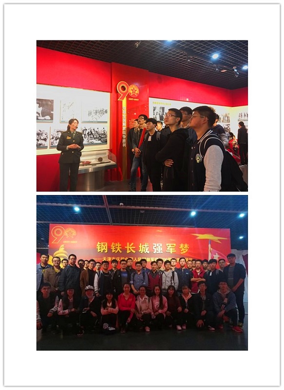 “天津市庆祝中国人民解放军建军90周年主题展览”以时间为主要脉络,分为“在土地革命战争中诞生成长”、“抗日战争的中流砥柱”、“夺取全国解放战争胜利”、“保卫人民民主政权和建设合成军队”、“开创军队建设新局面”、“加快推进中国特色军事变革”、“全面履行新世纪新阶段历史使命”、“在强军兴军新征程上阔步前行”、“人民军队在天津”9个部分。同学们在解说员的带领下,学习回顾了90年来党领导人民军队走过的光辉历程及取得的伟大成就。八一南昌起义打响第一枪、红军开展反“围剿”巩固革命根据地、平津战役胜利结束,人民解放军进入北平、毛主席强调“政治工作是我军生命线”、中国第一颗原子弹爆炸试验成功、我国自主研发的东风—31洲际弹道导弹、习近平总书记大力加强依法治军的政策……一幅幅珍贵照片记录了人民解放军成长壮大的历程,一件件文物资料把同学们带回了悲壮的战争年代。同学们不时驻足,在参观的同时认真记录,对90年来我国军队光辉的发展历程感受颇深。