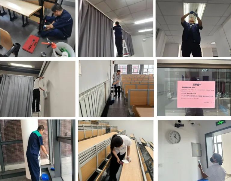 高效部署,保障有力。接到考试保障通知后,物业管理中心迅速响应,第一时间召开专项会议,制定详实保障方案,明确任务分工。考前,中心组织人员对考场内的桌椅、照明、钟表、空调、窗帘等设施设备进行了全面检修维护,同步完成了所有考场的深度清洁、消毒通风及封楼准备工作,确保考场环境安全、整洁、规范,各项设施运行良好。