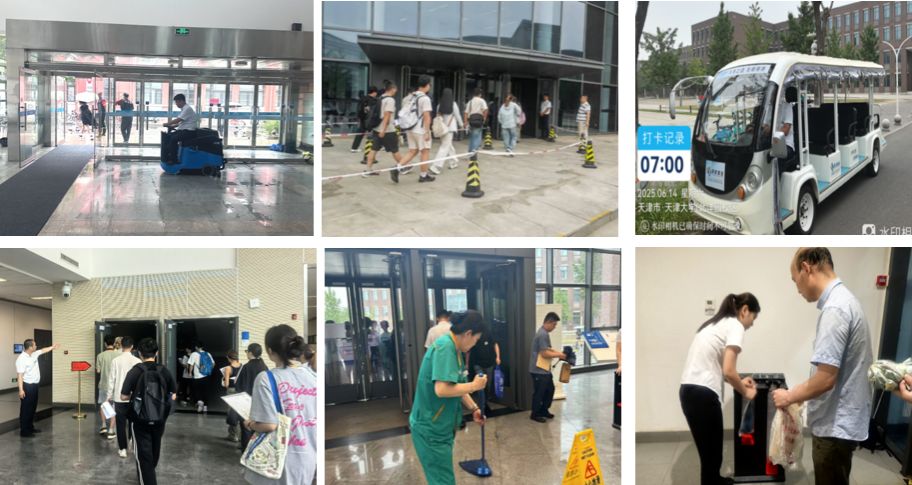 细致服务,全程护航。考试当天,工作人员提前开启考场空调,营造舒适环境。各考点安排专人引导考生入场,调配专车保障试卷转运与医疗支持。四级考试结束后,工作人员迅速完成考场设施检查、环境清理与消毒工作。六级考试前突遇阵雨,中心立即组织人员在关键通道铺设防滑垫、设立安全提示牌,并加强门厅及通道积水清理,有效保障了考试顺利进行和考生通行安全。
