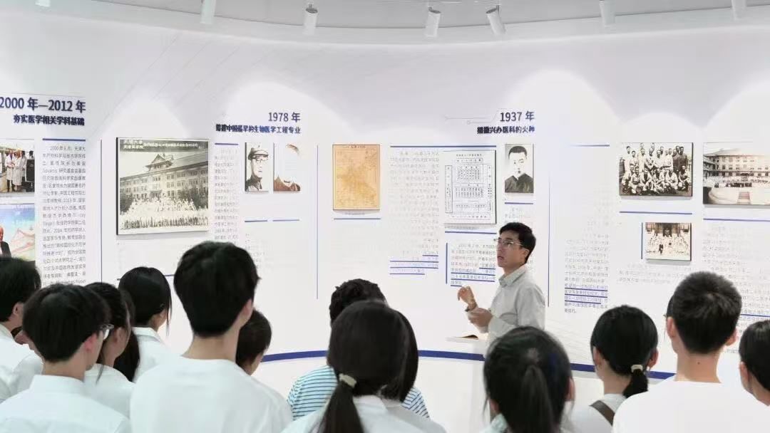 在“兴医之路”展厅,姚旺介绍了天津大学医学事业发展概况,溯源天大新医科建设的历史沿革,了解医学部各项标志性科研成果,感受医科的飞速发展。