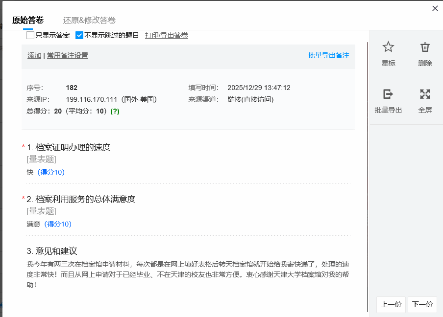 “作为天大的非全学生,在我想出国留学需要成绩证明的时候,辗转找到教务处的电话,告诉了我档案馆,接电话的老师们都非常亲和,档案馆的效率也非常高,只需要提交一下身份信息就可以拿到成绩证明,全程都没超过半天。目前我已顺利拿到国外学校offer,感谢天大,选择天大读书是我众多选择里最正确的一个。”这是日前档案馆向校友发放的调查问卷中,一位校友给档案馆的回复。2025年,档案馆努力为师生服务,通过信息技术提高效率,用真情、有温度接待用档需求,广受校友赞誉。