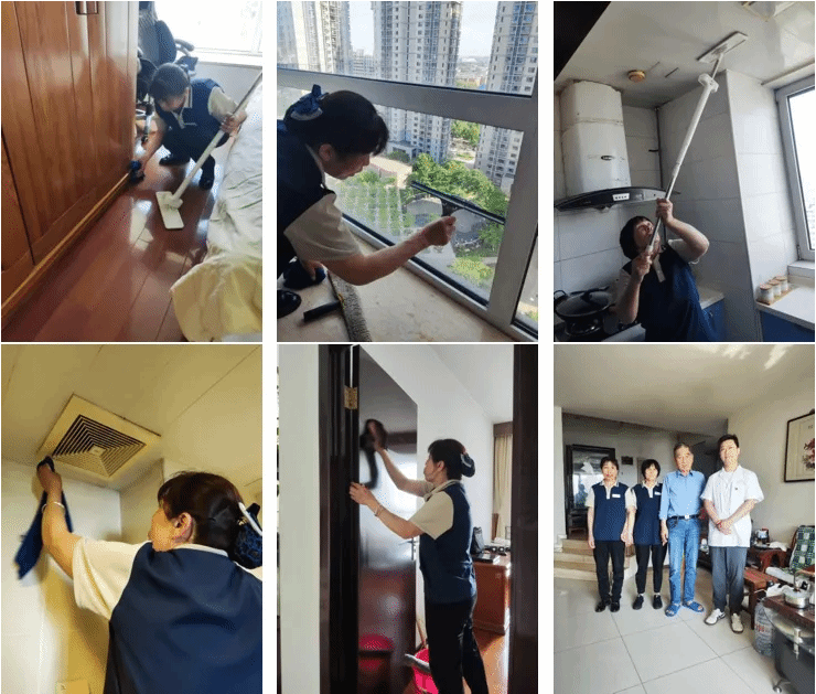 服务当日,物业团队员工身着统一工装,携带专业工具,在退休教职工家中展开“深度清洁行动”。工作人员为老人擦拭积灰的纱窗,清理空调滤网中的柳絮,俯身清理床底积尘,踮脚擦拭高处窗棂,连灯具缝隙、沙发角落等易忽略的卫生死角也一一打理。退休教职工老师感慨:“这些地方我自己根本够不着,多亏你们帮忙,家里亮堂多了!”清洁过程中,团队还贴心为老人开窗通风,让暮春的清风携花香盈满居室。